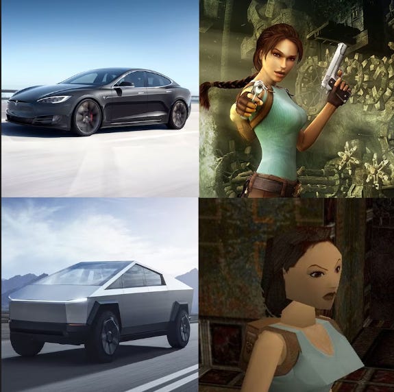 It could look like a mash-up of different vehicles altogether, or in the case of the Tesla Cybertruck, a low-bit Laura Croft from the game Tomb Raider: